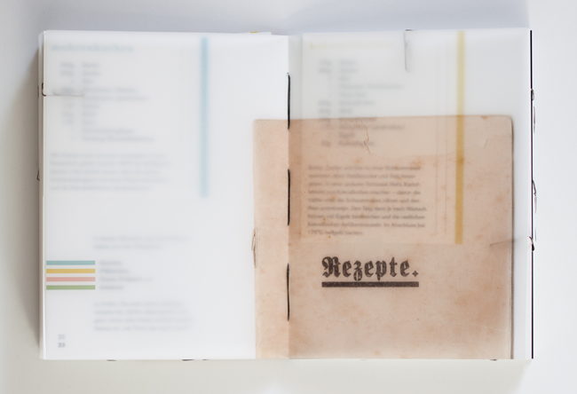 Life story and cuisine of my grandmother is perpetuated in Omas Rezeptbuch. The self-bound book tells the story of expulsion from home and arrival in different conditions. It shows the environment through pictures and clears the present: “The world